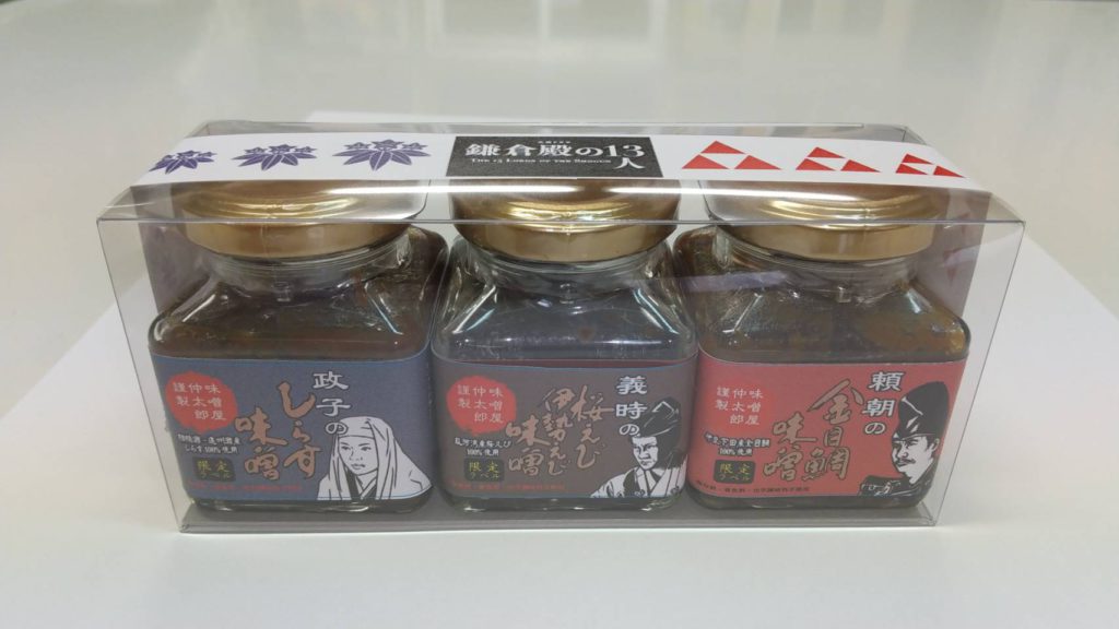 2022年NHK大河ドラマ【鎌倉殿の13人】コラボ商品、海鮮おかず味噌セットは、小栗旬演じる主人公の北条義時、小池栄子演じる北条政子、大泉洋演じる源頼朝をイメージした限定オリジナルラベルです。
